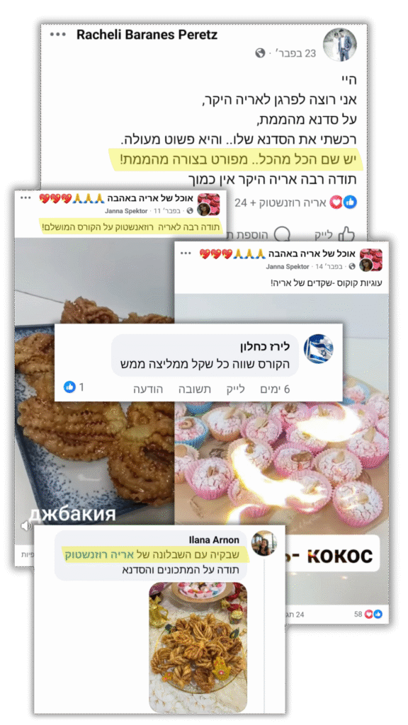 במקום לבזבז שעות בחיפוש מתכונים ברשת, לנחש מה יעבוד ולקוות שזה יצא טעים, הקורס נותן לך מתכונים איכותיים ומדויקים, מוסברים צעד-אחר-צעד. זה חוסך לך זמן, מאמץ ותסכול – כי מגיע לך להצליח מיד, בלי להתאמץ לחפש.